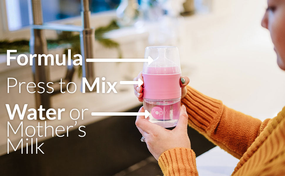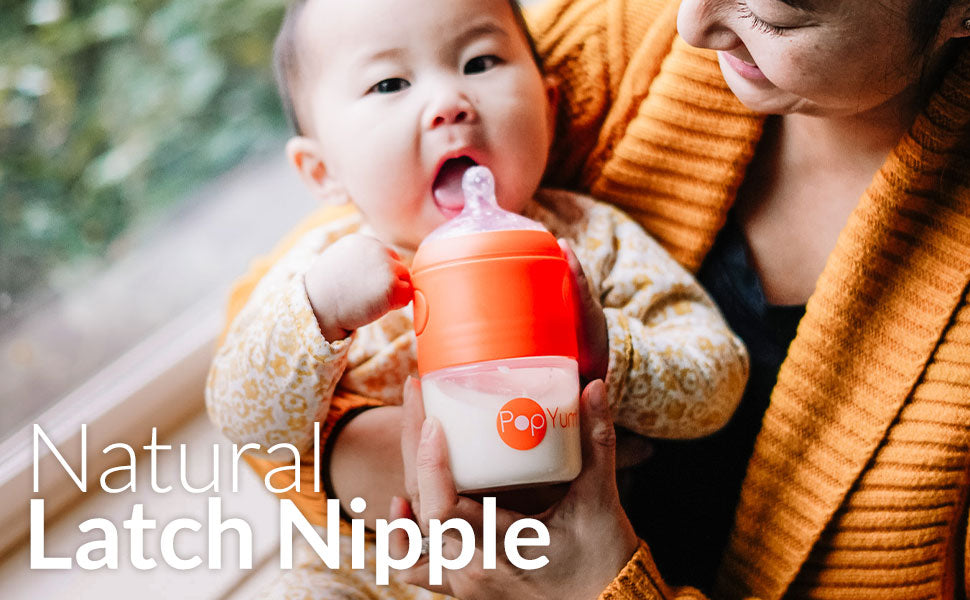 PopYum bottles feature a Natural Latch Nipple that mimics breastfeeding and a built-in powder-and-water compartment for super convenient mixing.